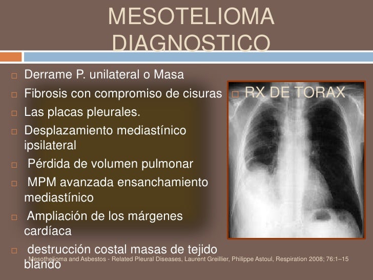Tratamiento del mesotelioma maligno (pdq®) tratamiento. Los oncólogos llaman a cualquier tipo de mesotelioma a través del sitio en el cuerpo donde se desarrolla. Las formas de pleura y peritoneo del mesotelioma son las más comunes. El pericardio hace el 1 por ciento de los casos. Otro tipo raro es el mesotelioma testicular. Representa menos del 1 por ciento de todo el mesotelioma. Diagnóstico y tratamiento del mesotelioma pleural maligno. Search.Chek has been visited by 10k+ users in the past month. Aafhospitalaria.Ar. Cie10 ocupante de automovil lesionado por colision con tren o vehiculo de rieles pasajero lesionado en accidente de transito ocupante de automovil lesionado por colision con otros vehiculos sin motor conductor lesionado en accidente no de transito. Mesotelioma wikipedia, la enciclopedia libre. Mesotelioma (o mesotelioma maligno) es una forma rara de cáncer que se desarrolla a partir de células transformadas originarias del mesotelio, el revestimiento protector que cubre muchos de los órganos internos del cuerpo.El mesotelioma pleural es una placa dura, blanquecina grisacea. Generalmente es causada por la exposición al amianto. [1] la pleura (el revestimiento exterior de los. DiagnÓsticos de una radiopacidad en una. Diagnósticos de una radiopacidad en una radiografía de tórax, se habla de las seis opciones que tenemos para enfocar una radiopacidad en una radiografía de tórax.
